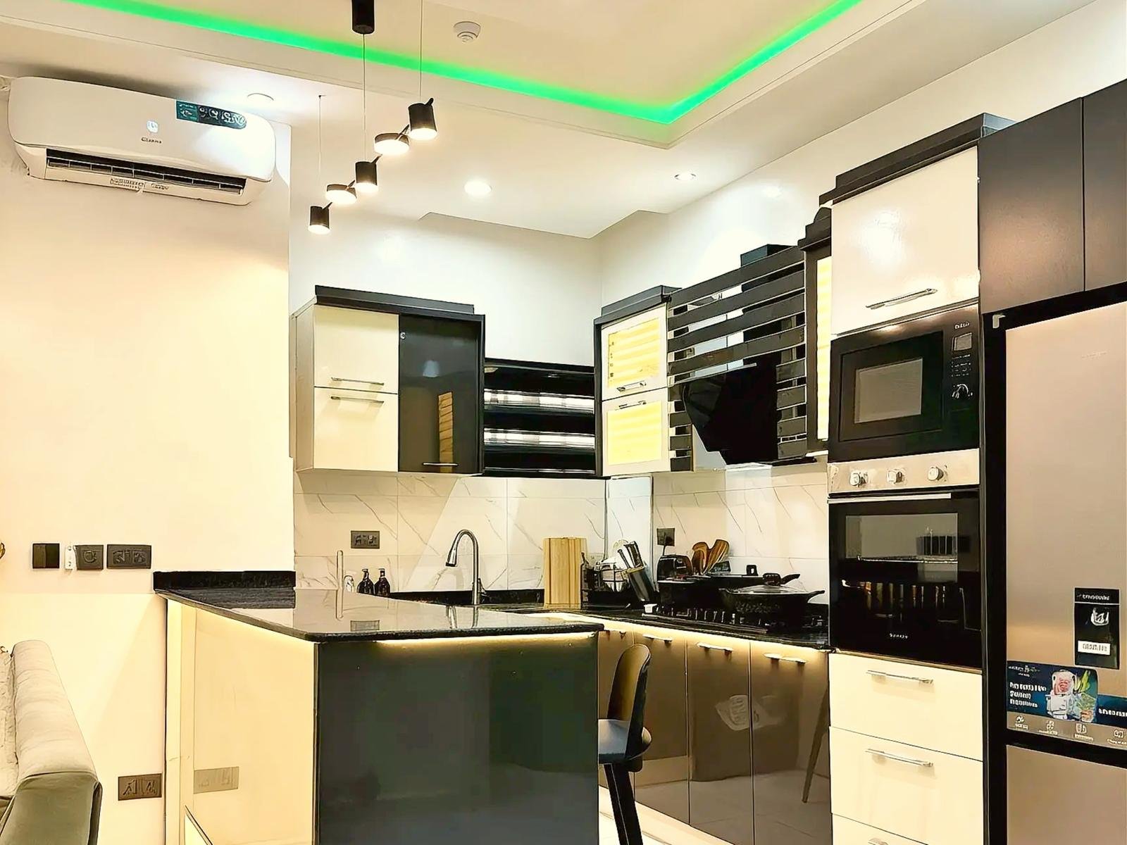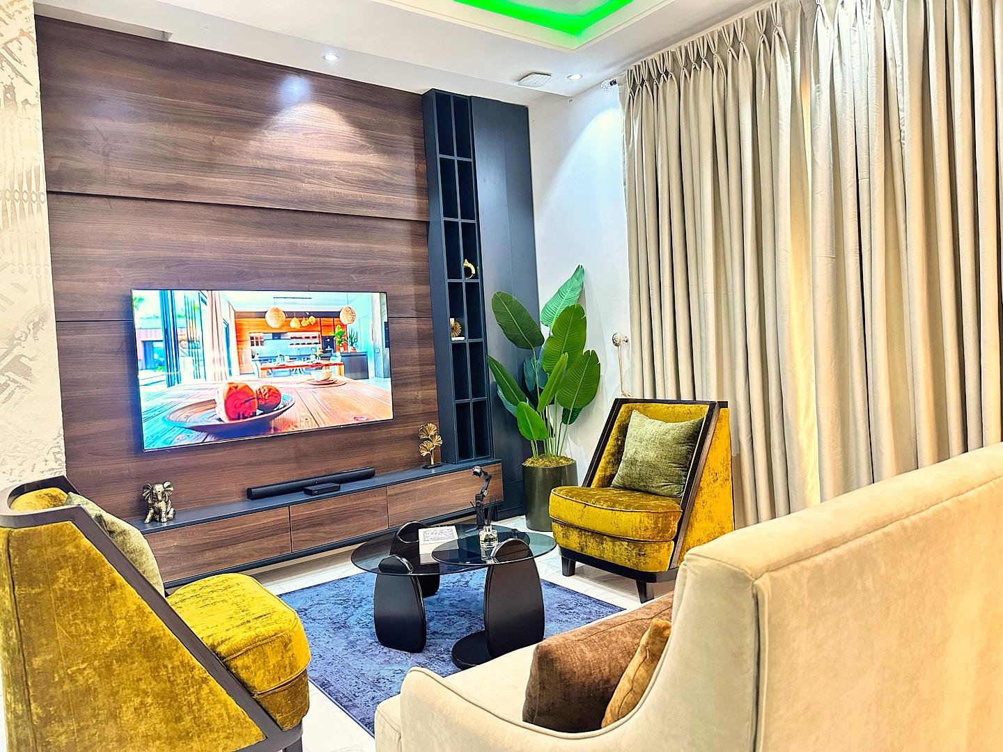 But the real magic happens when the sun goes down. The room comes alive with custom ambient lighting—from the modern ring chandelier to the subtle green cove lighting that traces the ceiling, setting a mood that is instantly relaxing. With a sleek, dark-wood entertainment unit and an open-concept kitchen just steps away, this is a space built for entertaining, relaxing, and living fully.